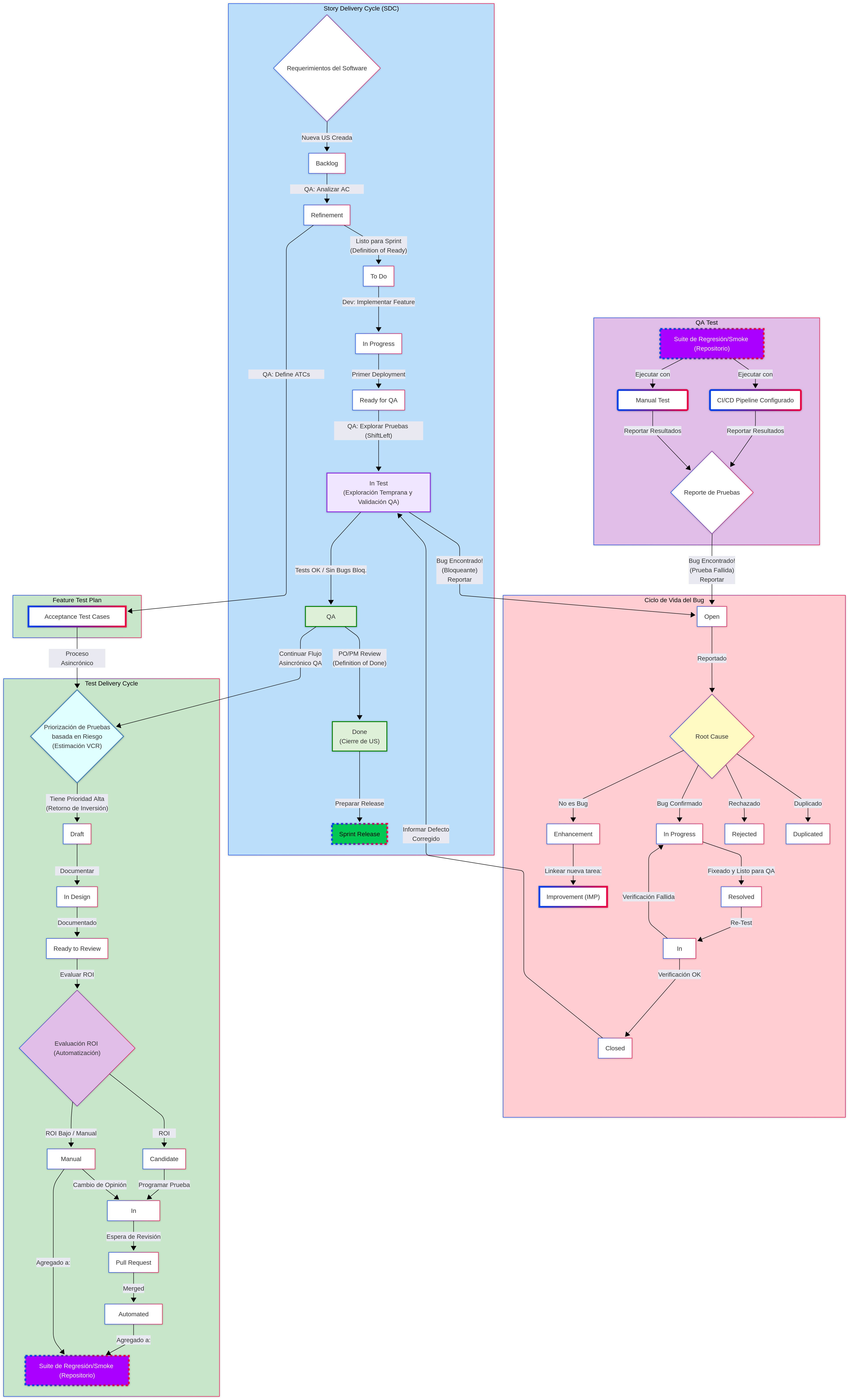 Este workflow muestra la operación táctica en Jira donde los tres ciclos principales se integran: desde cómo fluyen las User Stories (SDC), cómo se gestionan las pruebas (TDC), hasta cómo se manejan los defectos (BLC). Representa principalmente las fases Early-Game y Mid-Game del IQL.